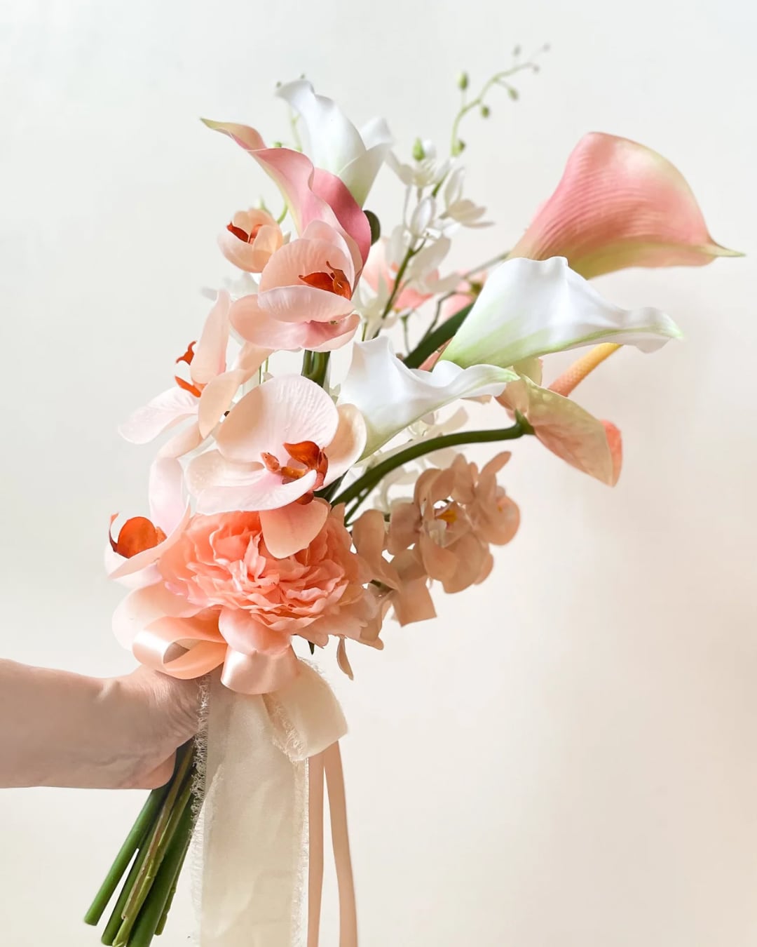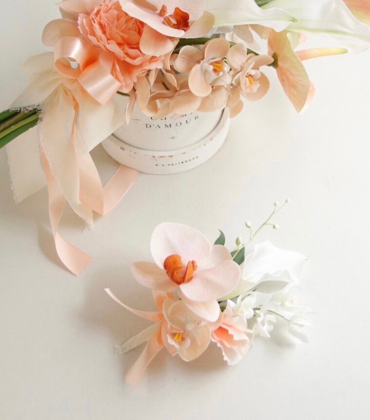 ピーチカラーの胡蝶蘭とカラーでお作りしたアームブーケです