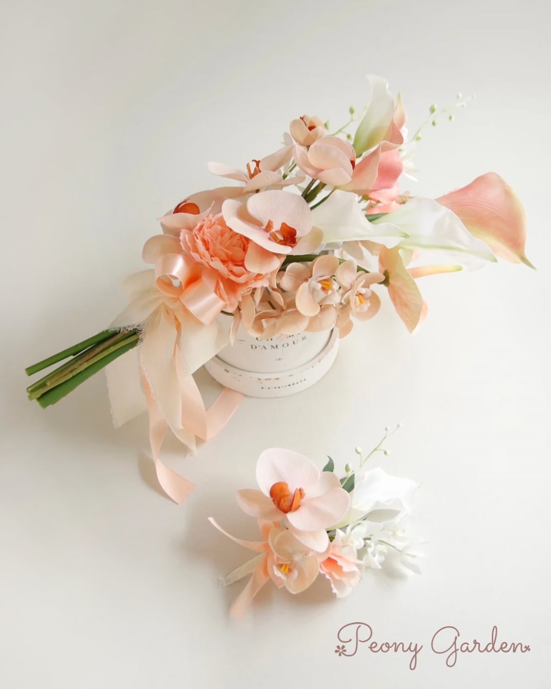 ー ウエディング ブライダル ブーケ ハンドメイド ナチュラルブーケ コサージュ ブートニア ヘッドドレス クラッチブーケ ウエディングベール ウエディングアクセサリー ウエディングフォト ウェディングブーケ、ブートニアセット 春色ブーケ ピーチカラー ロケーションフォト ピオニー 胡蝶蘭 カラー オレンジ スイートピー