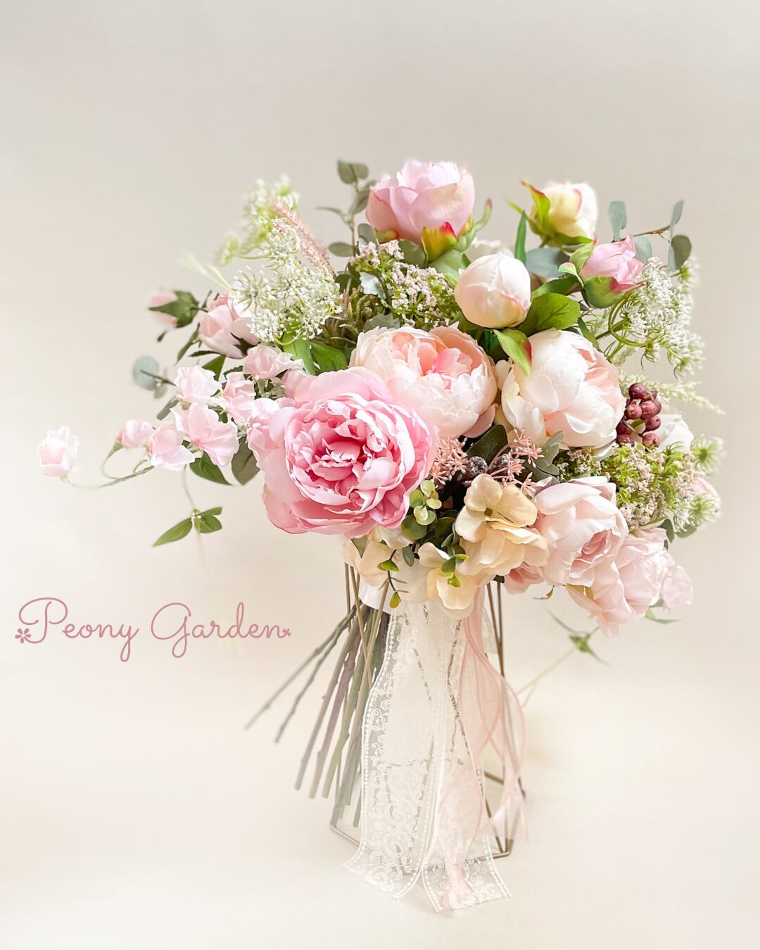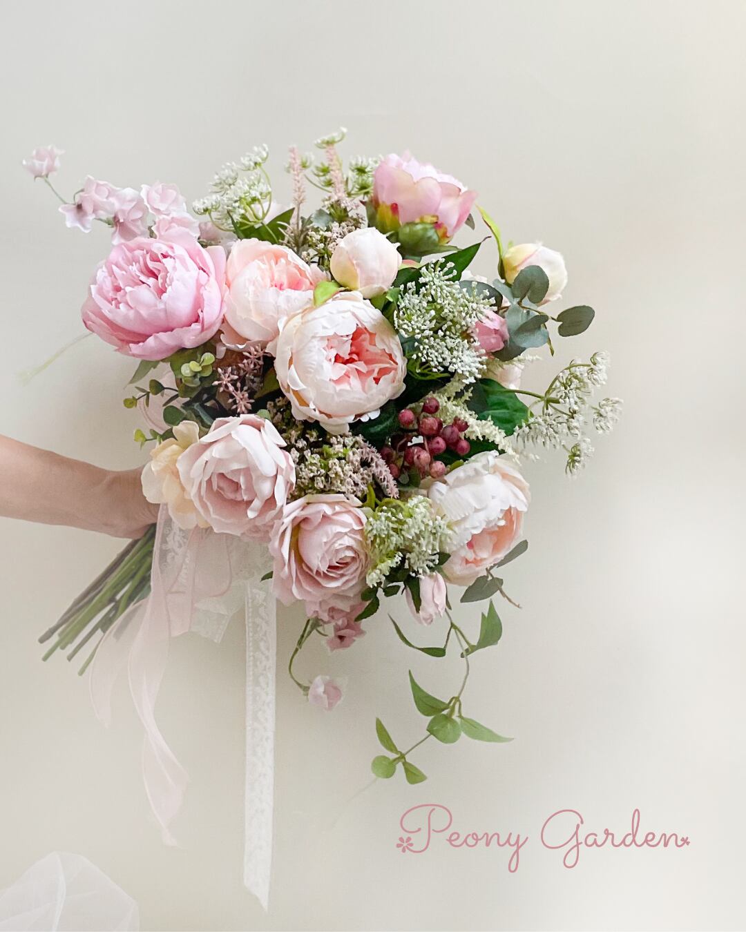 ピオニー・バラ・スイートピー・レースフラワー・リキュウソウ・ユーカリ・ベリー